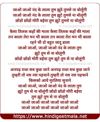 Lyrics of Jaao-Jaao Nand Ke Lala Tum Jhoote Tumse Na Bolungi - जाओ जाओ नंद के लाला तुम झूठे तुमसे ना बोलूँगी