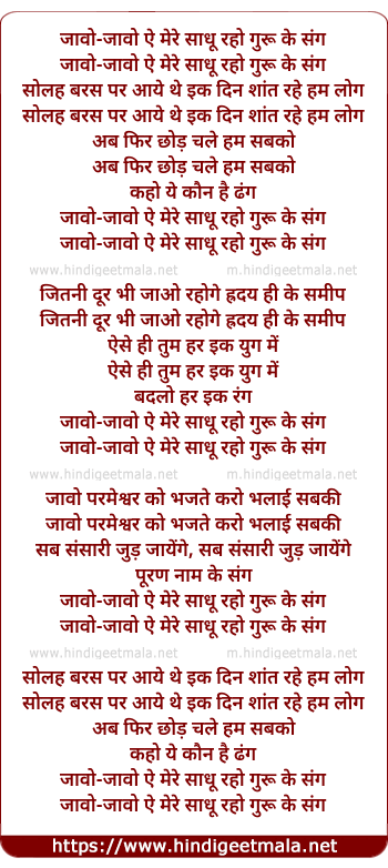 Lyrics of Jaavo Jaavo E Mere Saadhu Raho Guru Ke Sang - जावो-जावो ऐ मेरे साधू रहो गुरू के संग