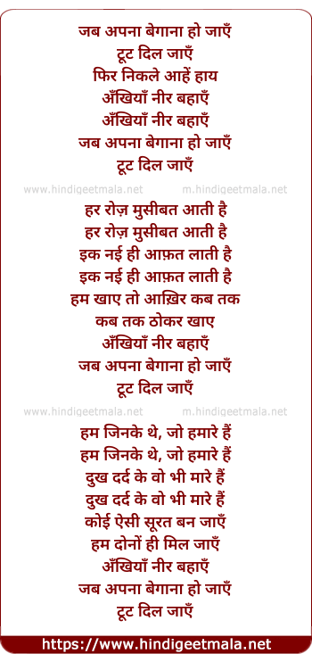 Lyrics of Jab Apanaa Begana Ho Jaye - जब अपना बेगाना हो जाएँ