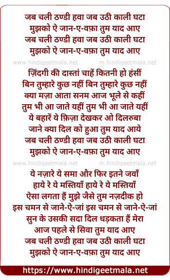 Lyrics of Jab Chali Thandi Havaa, Jab Uthi Kaali Ghataa - जब चली ठण्डी हवा जब उठी काली घटा