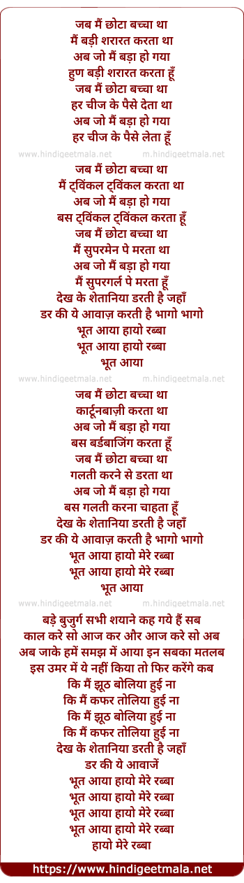 Lyrics of Jab Mai Chota Bacha Tha (Bhoot Aaya) - जब मैं छोटा बच्चा था