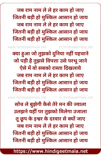 Lyrics of Jab Raam Naam Le Le Har Kaam Ho Jaaye, Jitni Badi Ho Mushkil Aasan Ho Jaaye - जब राम नाम ले ले हर काम हो जाए, जीतनी बड़ी हो मुश्किल आसान हो जाए