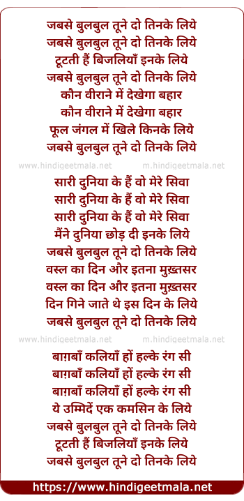 Lyrics of Jab Se Bulbul Tune - जबसे बुलबुल तूने