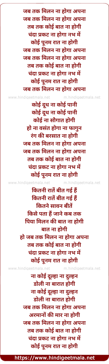 Lyrics of Jab Tak Milan Na Hoga Apna - जब तक मिलन ना होगा अपना