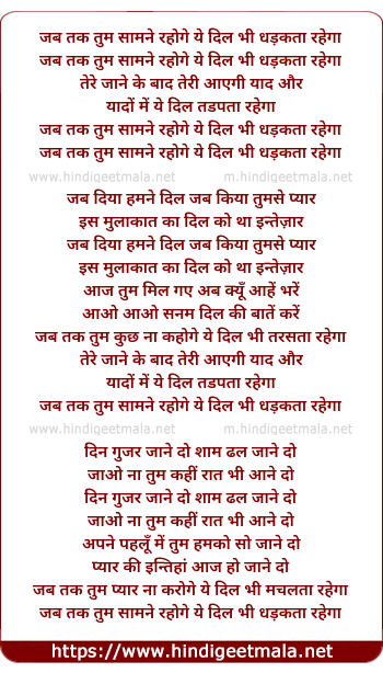 Lyrics of Jab Tak Tum Saamne Rahoge - जब तक तुम सामने रहोगे