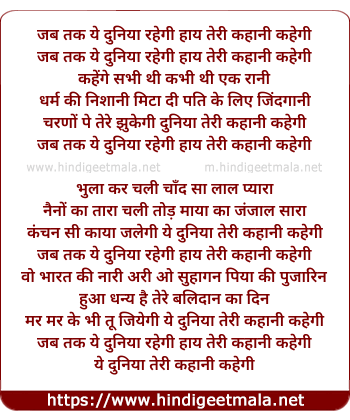 Lyrics of Jab Tak Ye Duniya Rahegi - जब तक ये दुनिया रहेगी