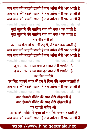 Lyrics of Jab Yaad Ki Badli Chhati Hai - जब याद की बदली छाती है