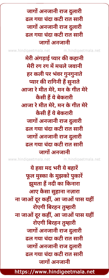Lyrics of Jago Anjaani Raj Dulari - जागों अनजानी राज दुलारी