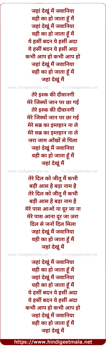 Lyrics of Jahan Dekhoon Main Jawaniya - जहाँ देखूं मैं जवानिया