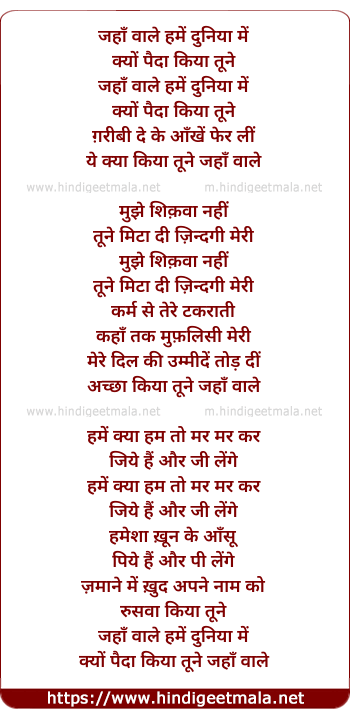 Poetic Translation - Lyrics of Jahan Wale Hame Duneeya Me - जहाँ वाले हमें दुनिया में