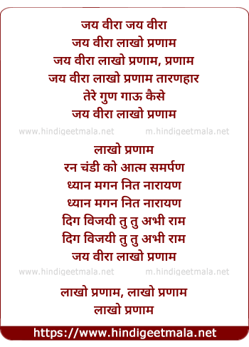 Lyrics of Jai Veera Lakho Parnam - जय वीरा लाखो प्रणाम