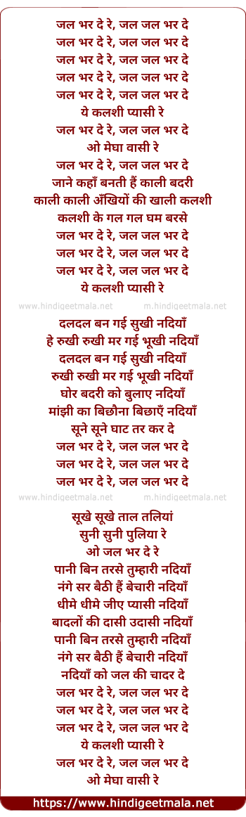 Lyrics of Jal Bhar De - जल भर दे रे, जल जल भर दे