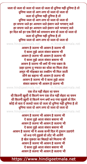 Lyrics of Jala Do Jala Do Duniya Yahi Duniya Hai To Duniya Ko Jala Do - जला दो जला दो दुनिया यही दुनिया है तो दुनिया जला दो