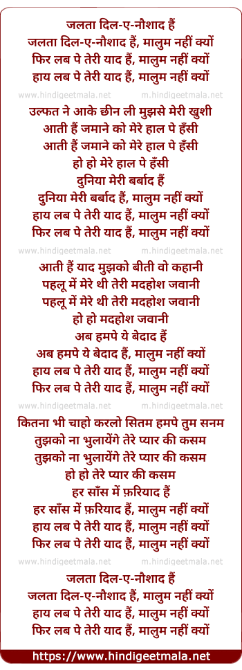 Lyrics of Jalta Dil-E-Naushad Hai Malum Nahi - जलता दिल-ए-नौशाद हैं मालुम नहीं
