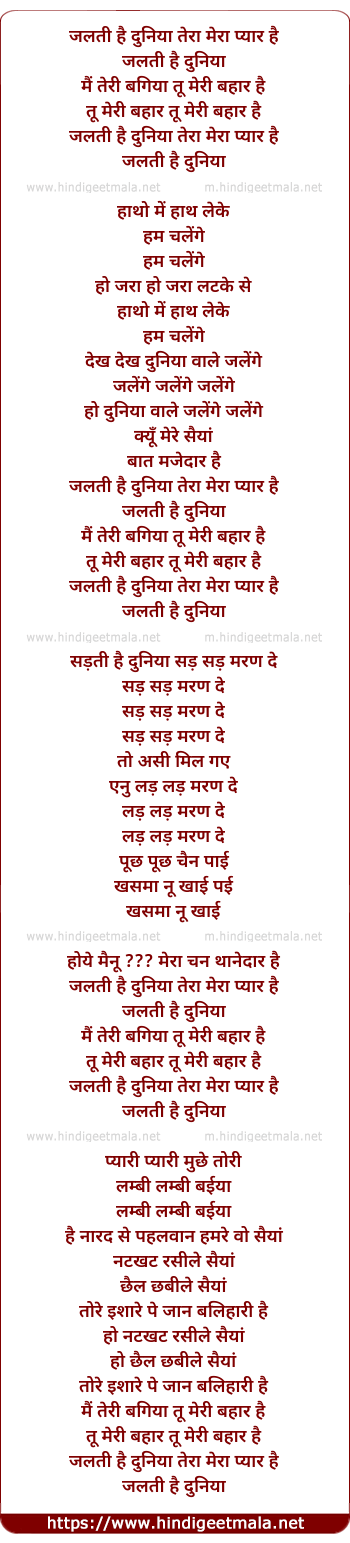 Lyrics of Jalti Hai Dunia Tera Mera Pyar Hai - जलती है दुनिया तेरा मेरा प्यार है