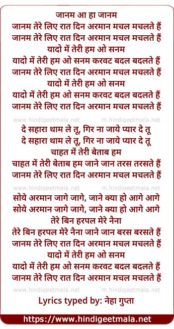 Lyrics of Janam Tere Liye Rat Din - जानम तेरे लिए रात दिन