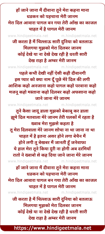 Lyrics of Jane Jana Mai Diwana Tune Mera Kahna Mana - जाने जाना मैं दीवाना तूने मेरा कहना माना