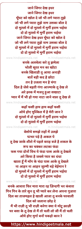 Lyrics of Jane Jigar Dekh Idhar - जाने जिगर देख इधर