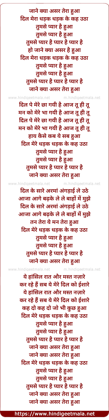 Lyrics of Jane Kya Asar Tera Hua (1) - जाने क्या असर तेरा हुआ
