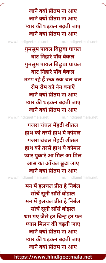 Lyrics of Jane Kyo Pritam Na Aaye - जाने क्यों प्रीतम ना आए