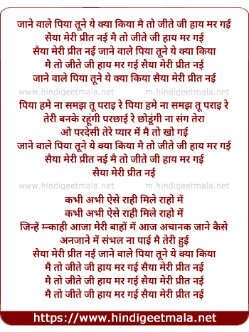 Lyrics of Jane Wale Piyaa Tune Ye Kya Kiya, Main To Jeete Ji Haye Mar Gayi - जाने वाले पिया तूने ये क्या किया, मैं तो जीते जी हाय मर गई