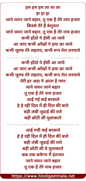 jane chaman jane bahar, tu ek hai tere nam hajar