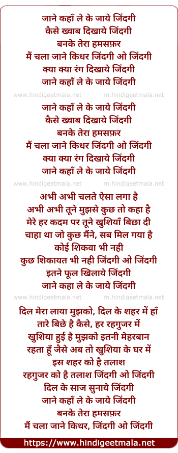 Lyrics of Janey Kaha Le Ke Jaye Jindagee - जाने कहाँ ले के जाये जिंदगी