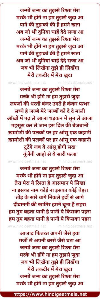 Lyrics of Janmo Janam Ka Tujhse Rishtaa Mera - जन्मों जन्म का तुझसे रिश्ता मेरा