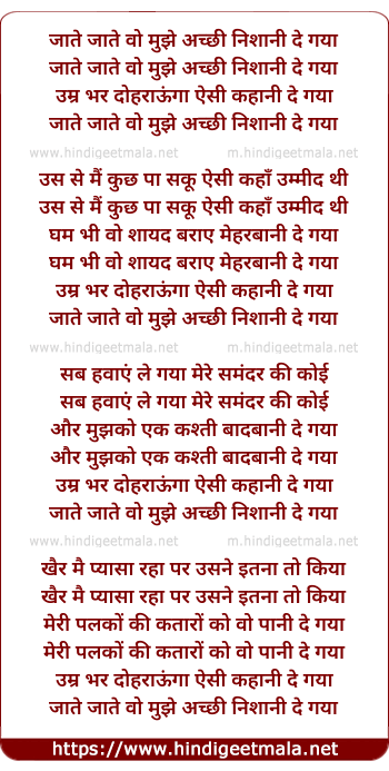 Lyrics of Jate Jate Wo Mujhe Achi Nishani De Gaya - जाते जाते वो मुझे अच्छी निशानी दे गया