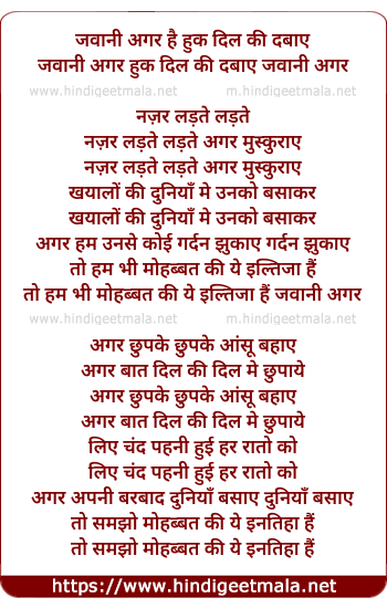 Lyrics of Jawani Agar Huk Dil Ki Dabaye - जवानी अगर है हुक दिल की दबाए