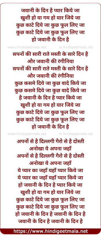Lyrics of Jawani Ke Din Hai Pyar Kiye Ja - जवानी के दिन है प्यार किये जा