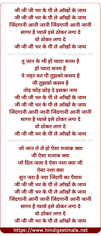 Lyrics of Jee Bhar Ke Pee Le Ankho Ke Jaam - जी भर के पी ले आँखों के जाम