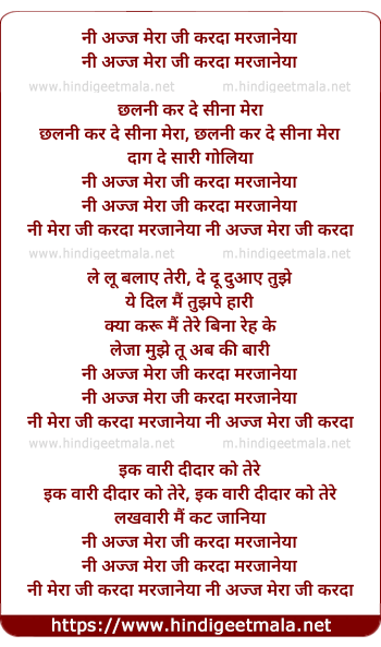 ni mera jee karda marjaneya ni ajj mera jee karda