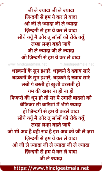 Lyrics of Jee Le Jyada (Part- Ll) - जी ले ज्यादा