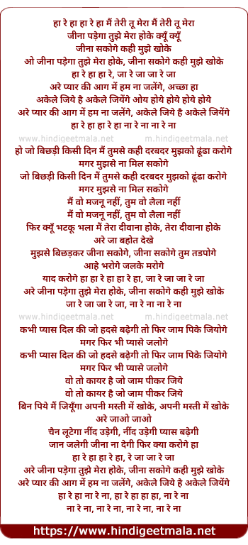 Lyrics of Jeena Padega Tumhe Mera Hoke - जीना पड़ेगा तुम्हे मेरा होके