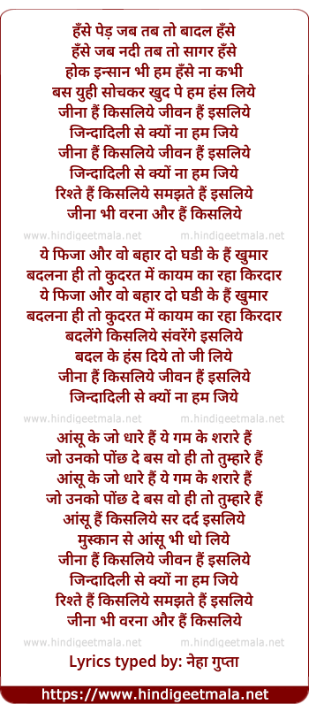 Lyrics of Jeenaa Hai Kis Liye - जीना है किस लिए