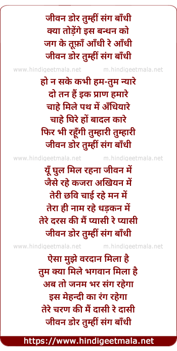Lyrics of Jeevan Dor Tumhi Sang Bandhi - जीवन डोर तुम्हीं संग बाँधी
