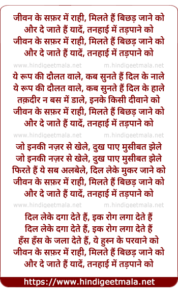 "jeewan ke safar me rahi,miltey hein bichhud jaane ko aur de jaate hein