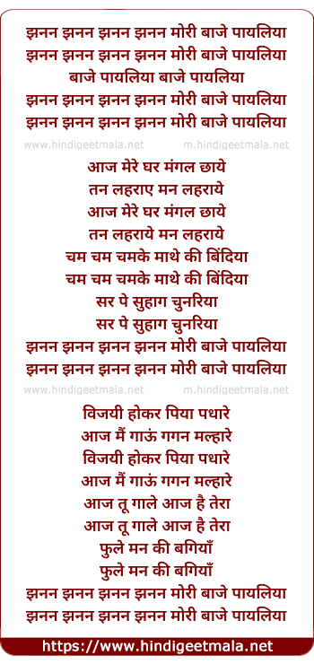 Lyrics of Jhanan Mori Baje Payaliya - झनन झनन झनन झनन मोरी बाजे पायलिया