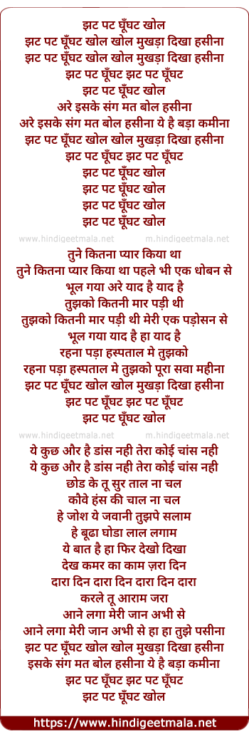 Lyrics of Jhat Pat Ghunghat Khol, Mukhda Dekha Haseena - झट पट घूँघट खोल, मुखड़ा दिखा हसीना