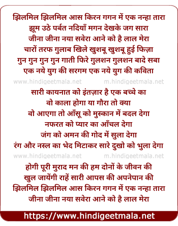 Lyrics of Jhilmil Jhilmil Aas Kiran - झिलमिल झिलमिल आस किरन