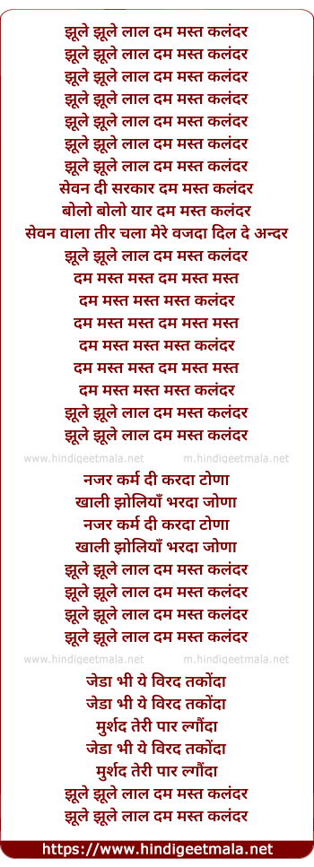 Lyrics of Jhoole Jhule Laal - झूले झूले लाल दम मस्त कलंदर