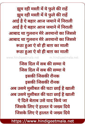 Lyrics of Jhoom Rahi Masti Me - झूम रही मस्ती में ये फुले की राहें