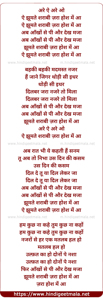 Lyrics of Jhoomte Sharabi Zara Hosh Mein Aa - झूमते शराबी ज़रा होश में आ