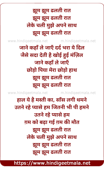 Lyrics of Jhum Jhum Dhalti Raat, Leke Chali Mujhe Apne Sath - झूम झूम ढलती रात, लेके चली मुझे अपने साथ