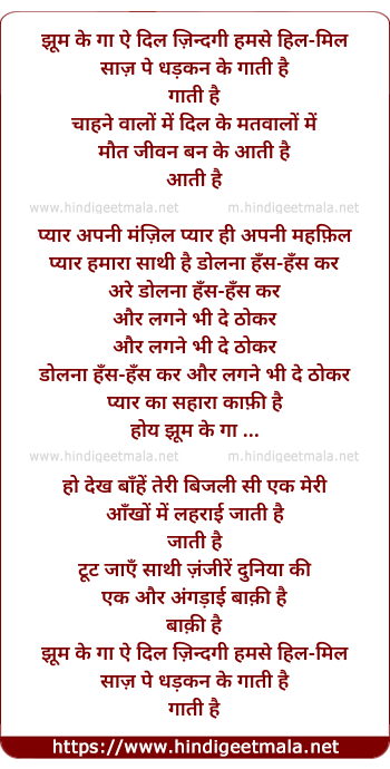 Lyrics of Jhum Ke Ga Ae Dil - मु : झूम के गा ऐ दिल ज़िन्दगी हमसे हिल-मिल