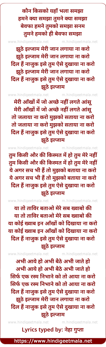 Lyrics of Jhuthe Iljaam Meri Jaan Lagaya Na Karo - झूठे इल्जाम मेरी जान लगाया ना करो