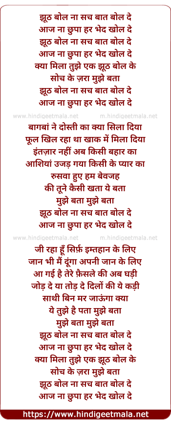 Lyrics of Jhuth Bol Naa Sach Baat Bol De - झूठ बोल ना सच बात बोल दे