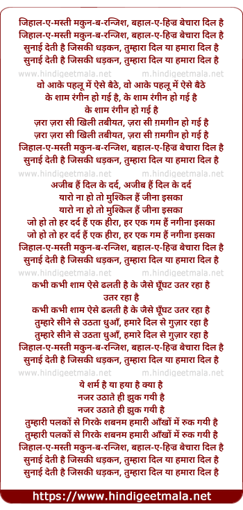 Lyrics of Jihaal E Masti Makun Ba Ranjish - जिहाल ए मस्ती मकुन ब रन्जिश