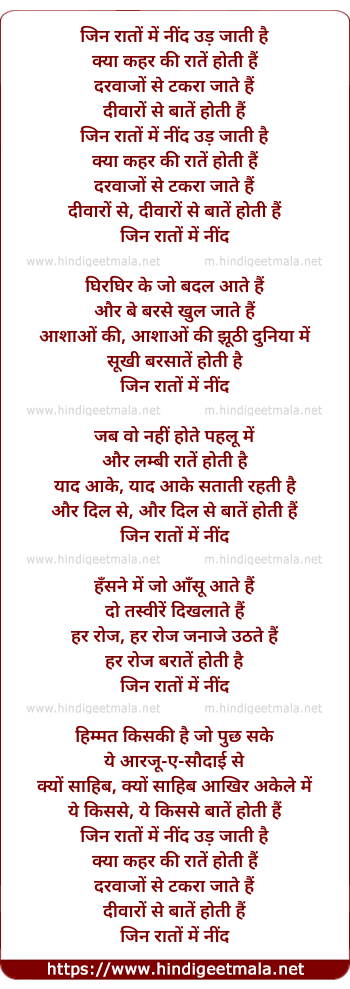 Lyrics of Jin Raaton Men Nind Ud Jaati Hai - जिन रातों में नींद उड़ जाती है
